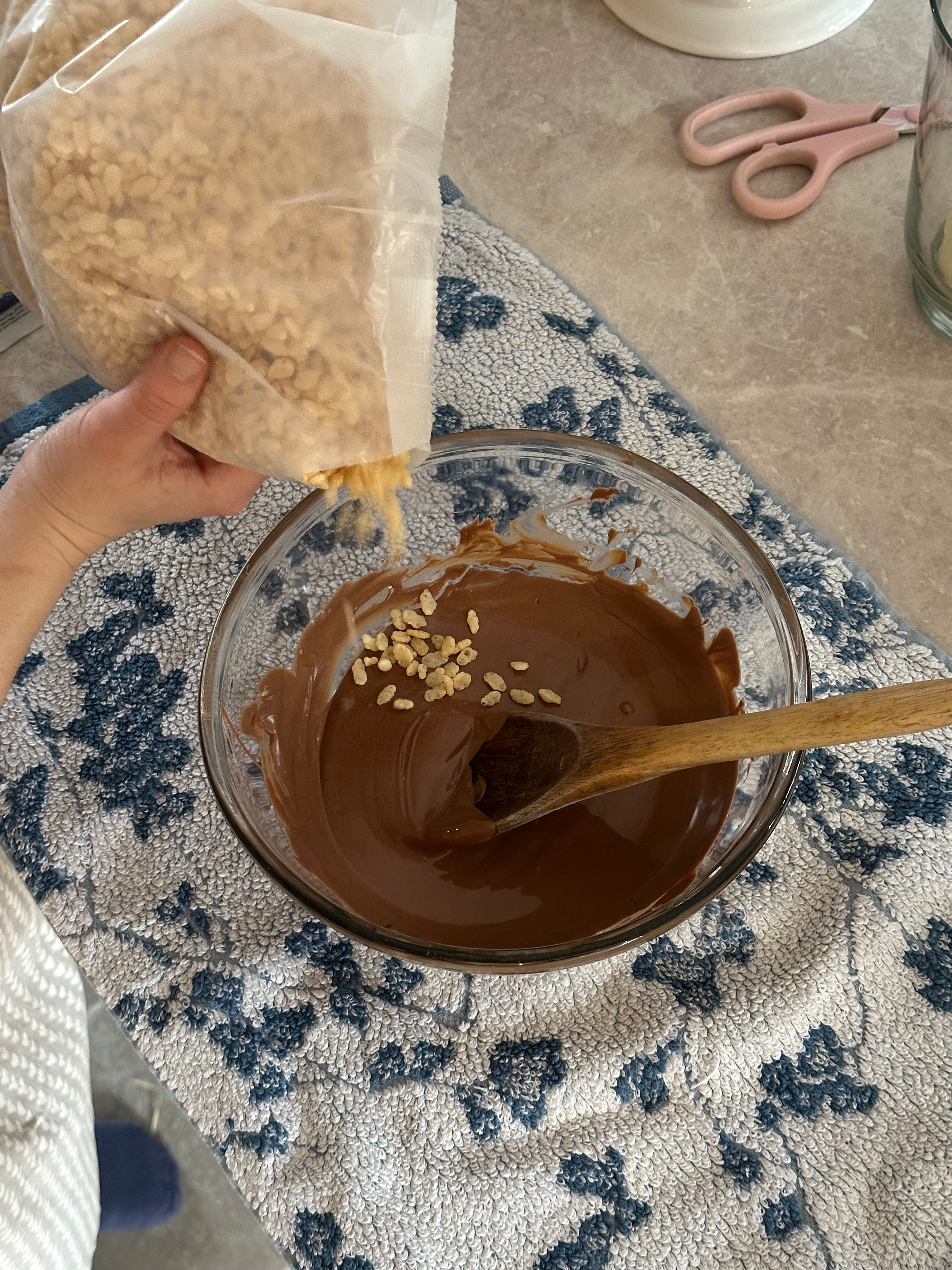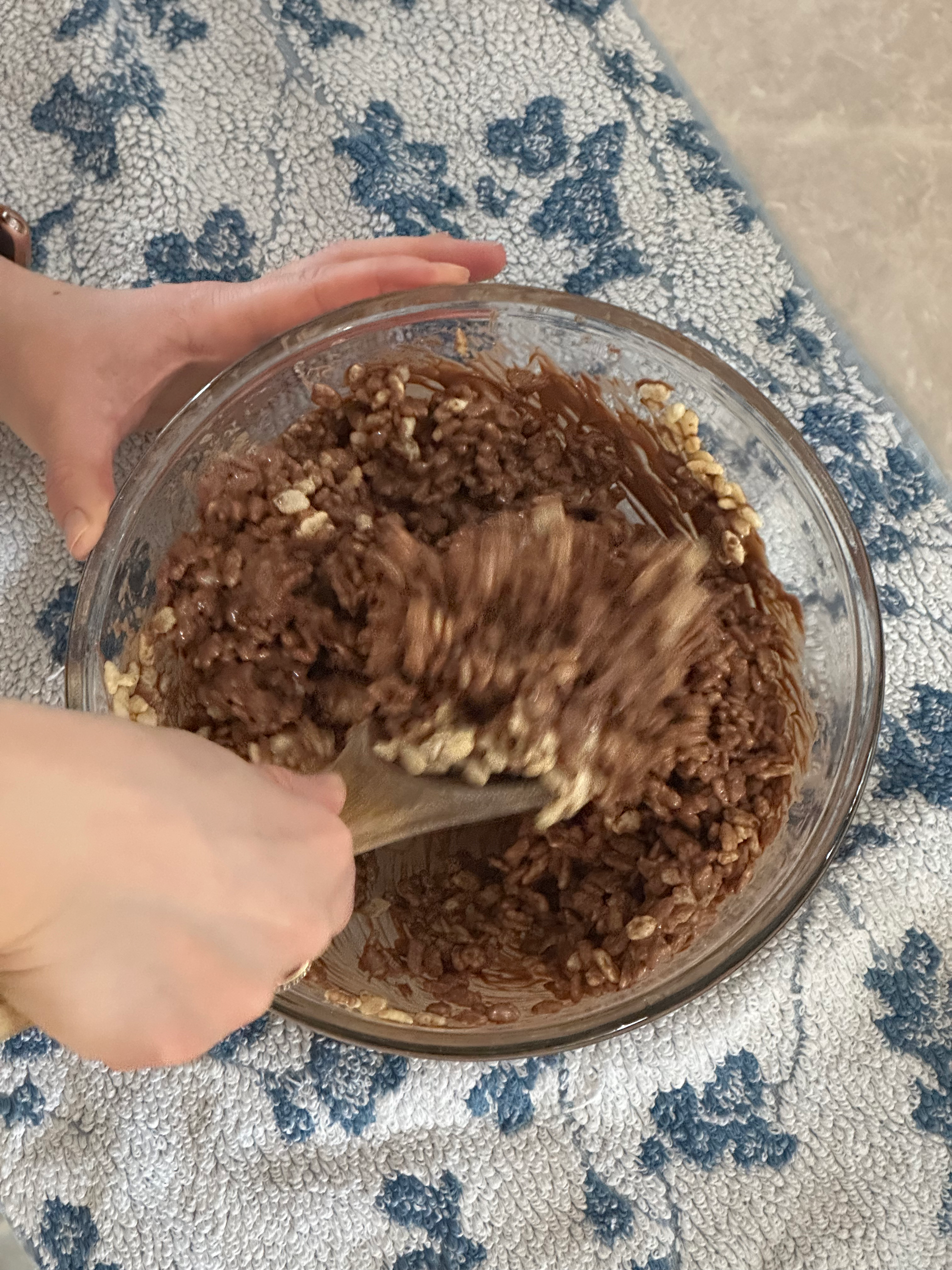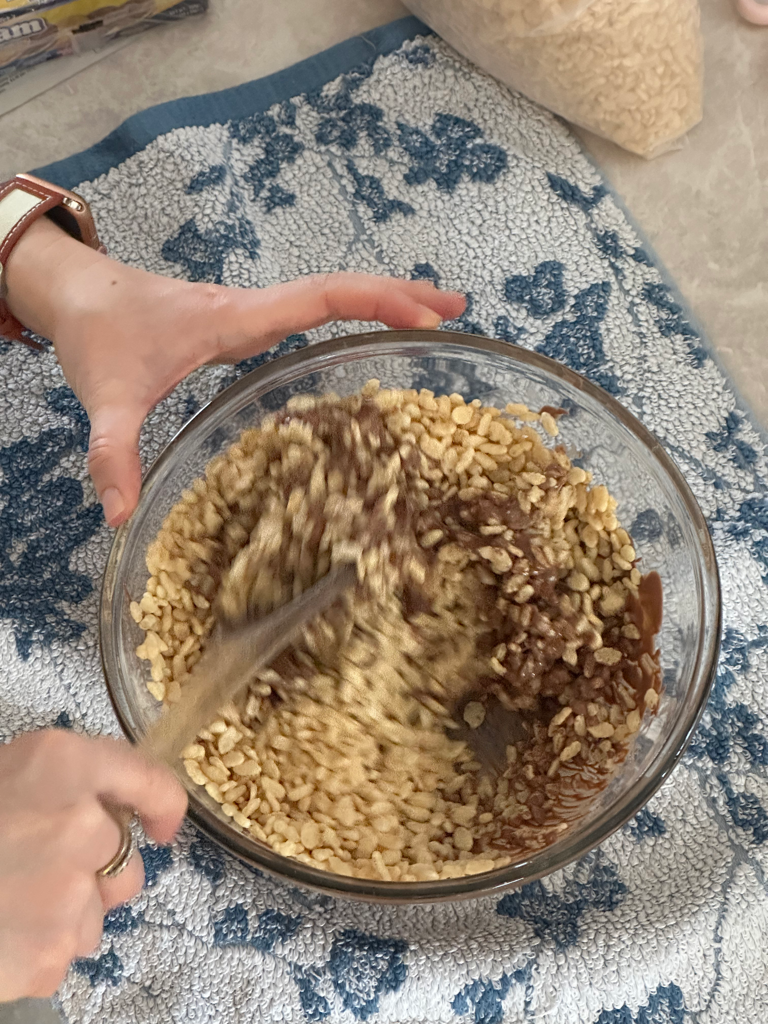 - Fold in rice krispy cereal until evenly coated.